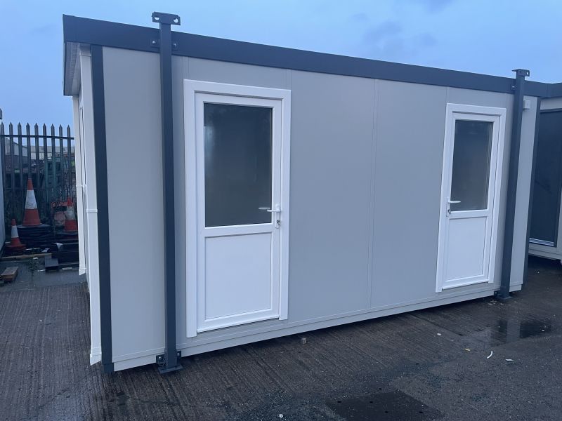 5m x 3m jack leg cabin divided into two smaller areas, each with a separate door and also sliding white Upvc double glazed windows.
